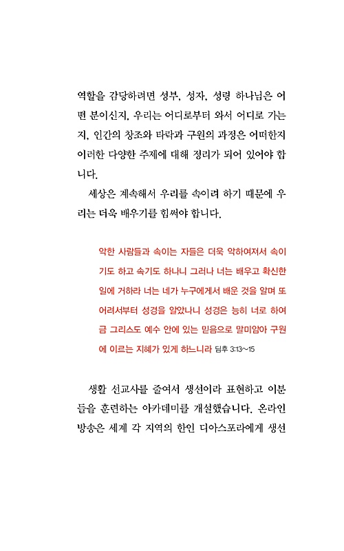 생활 선교사를 줄여서 생선이라 표현하고 이분들을 훈련하는 아카데미가 개설되어있습니다. 온라인 방송은 세계 각 지역의 한인 디아스포라에게 생선아카데미를 전파할 수 있는 좋은 수단이 되었습니다. 이러한 강의 내용을 다듬고 핵심을 정리하여 각각의 주제를 명확하게 이해할 수 있도록 소책자 형식으로 발간했습니다.