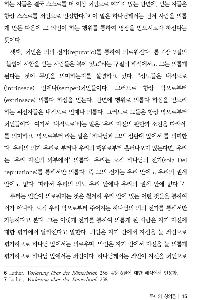 “칭의론”은 종교개혁 이후 개신교가 로마 가톨릭에 맞서서 특별히 강조했던 교리 가운데 하나이다. 세상을 뒤흔든 종교개혁자 마르틴 루터는 시편 130편 4절을 주해하면서 이 교리가 확립되면 교회도 확립되고, 이 교리가 무너지면 교회도 무너진다고 주장했다(WA 40/3, 352, 3). 역시 종교개혁자 존 칼빈은 칭의가 모든 참된 종교가 지켜야 할 교리라고 보았다. 이와 같이 종교개혁은 칭의를 떠나서는 사실상 성립될 수 없다고 해도 과언이 아닐 것이다.