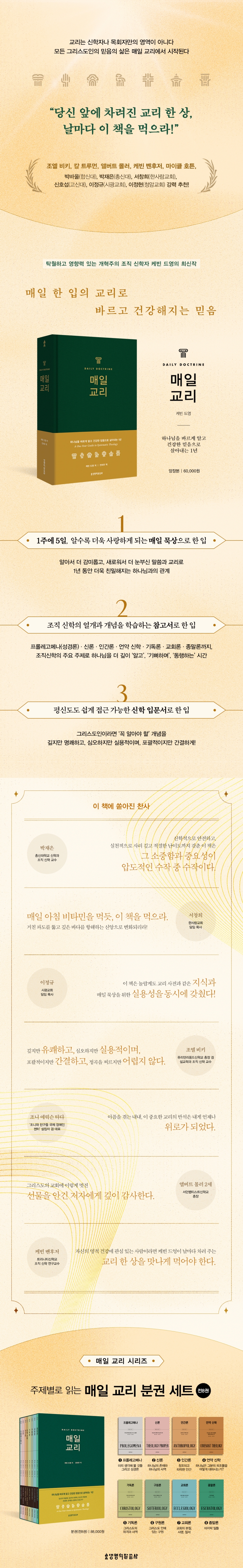 이 없다. 이런 점에서 이 책은 아주 큰 도움이 된다. 케빈 드영은 오랜 세월에 걸쳐 가치가 입증된 ‘매일 묵상’이란 방법을 사용해, 성경이 가르치는 중요한 교리를 톺아보는 책을 냈다. 그 덕에 우리는 기독교 교리가 얼마나 아름답고 우리의 성경 읽기와 삶의 방식에 얼마나 중요한지 좀 더 알 수 있게 되었다.