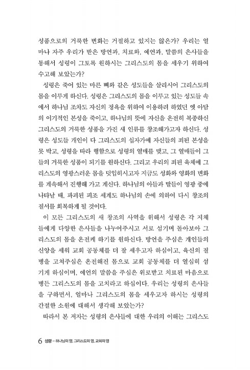 성령의 은사를 받기 위한 최고의 방법이 무엇인지 아는가? 그것은 그리스도의 몸을 향한 성령의 불타는 열정을 마음에 품는 것이다. 이 그리스도의 몸을 향한 성령의 불타는 열정을 본 저자와 독자들이 공유할 때, 우리는 언어적, 문화적, 그리고 학문적 장애물들을 극복하고 서로 이해하고 소통할 수 있는 성령의 큰 은혜를 맛보게 될 것이다.