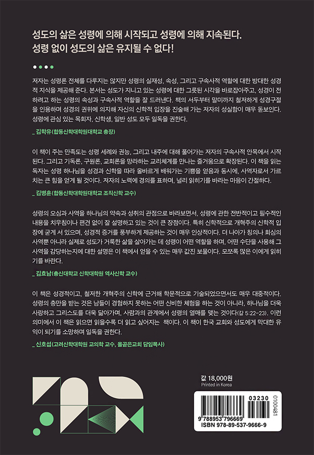 이 책이 주는 만족도는 성령 세례와 권능, 그리고 내주에 대해 풀어가는 저자의 구속사적 안목에서 시작도니다. 그리고 기독론, 구원론, 교회론을 망라하는 교리체계를 만나는 즐거움으로 확장된다. 이 책을 읽는 독자는 성령 하나님을 성경과 신학을 따라 올바르게 배워가는 기쁨을 얻음과 동시에, 사역자로서 가르치는 큰 힘을 얻게 될 것이다. 저자의 노력에 경의를 표하며, 널리 읽히기를 바라는 마음이 간절하다.