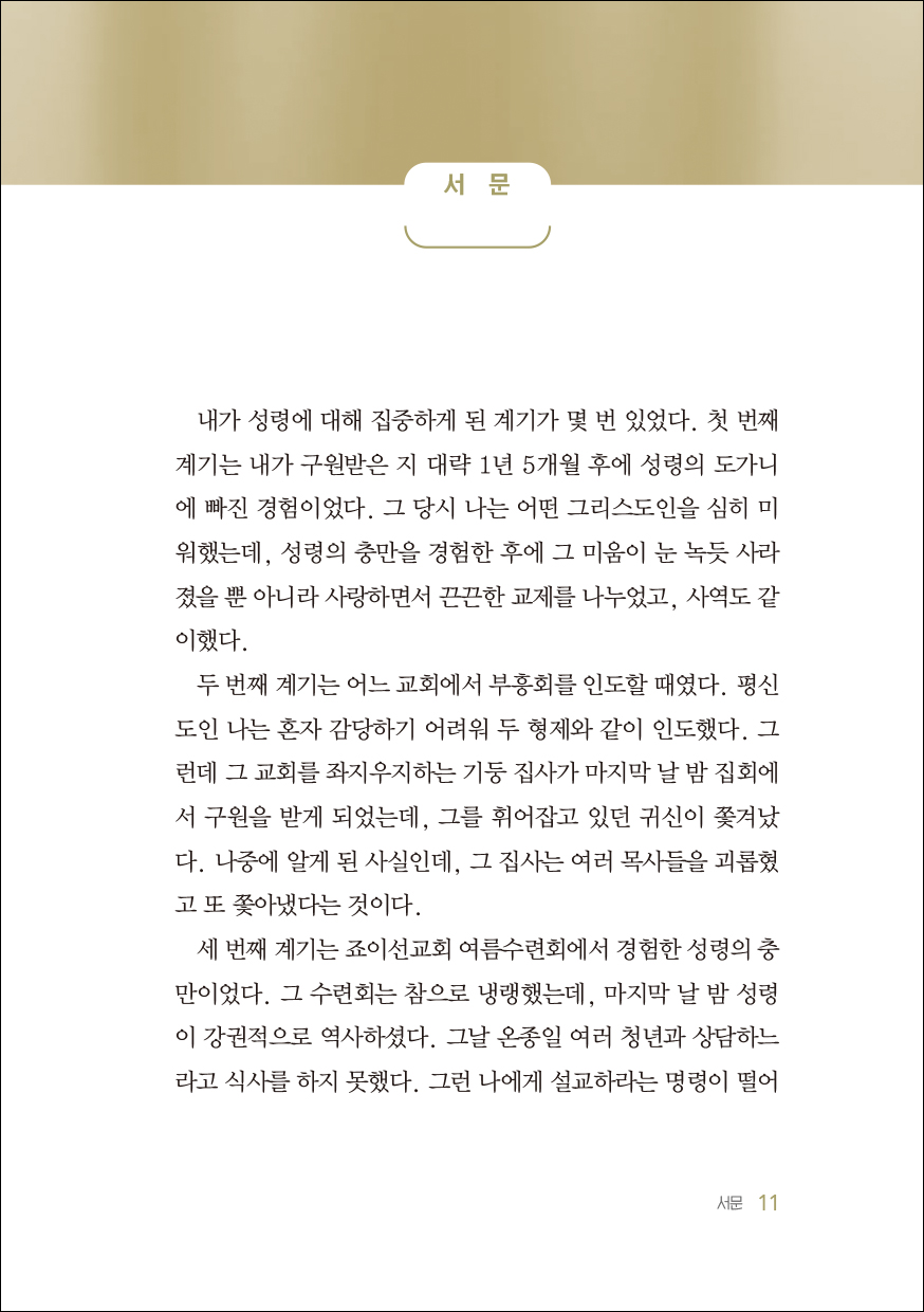 그 이후에도 시시때때로 성령이 강권적으로 역사하시는 은총을 경험했다. 나는 성령 충만의 경험을 체계적으로 설명할 수 없었는데, 성령에 대해 알지 못했기 때문이다. 그러던 중 빌리 그레이엄Billy Graham의 『성령』The Holy Spirit이란 책을 읽게 되었는데, 그야말로 나의 눈을 크게 열어준 귀한 책이었다. 성령에 관한 한 그 책은 나에게 지침서요 교과서였다.