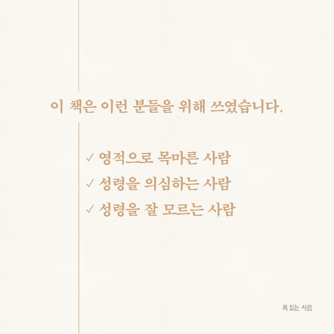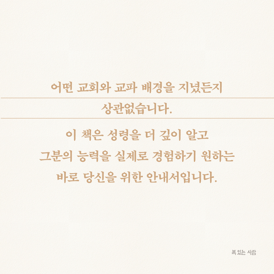 오늘날 많은 그리스도인들은 진정한 영적 체험을 갈망하지만, 성령에 대한 바른 지식이나 인격적인 관계를 충분히 형성하지 못한다. 그분을 둘러싼 혼란과 낯섦 때문에 성령을 주변부로 밀어내거나, 그분이 누구이시며 우리의 신앙생활에서 어떤 의미를 갖는지 오해하곤 한다. 그러나 복된 소식이 있다. 우리 안에 거하시며 능력과 변화를 주시는 성령 하나님의 임재가 이미 우리에게 자유롭게 열려 있다는 것이다.