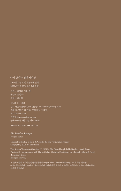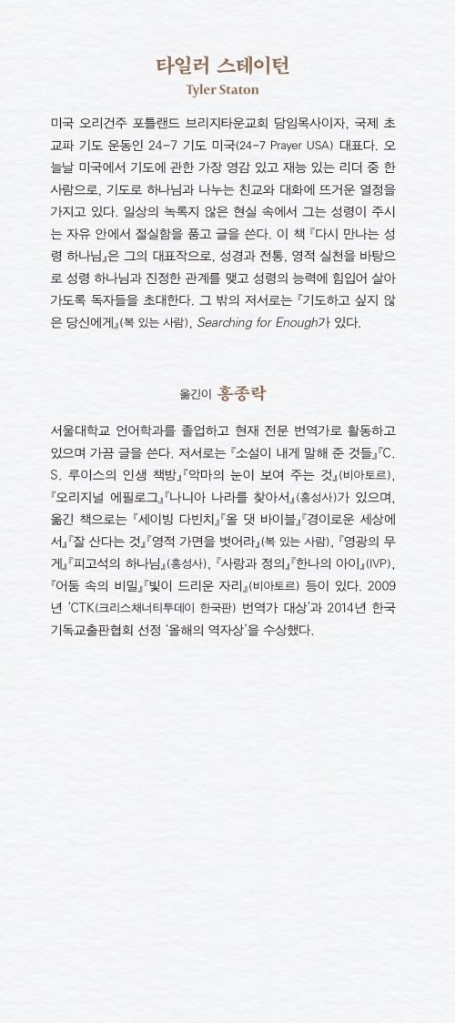 아름다운 영혼에게서 나온 아름다운 책이다. 저자의 삶과 사역은 성령의 인격과 사역을 발견하면서 완전히 변했다. 나 역시 그랬고 당신도 그럴 수 있다. 타일러가 성령을 ‘친숙한 타자’라고 부르는 것은 우리 안에 있는 하나님을 더 깊이 경험하고자 하는 갈망을 정확히 짚어낸 표현이다. 이 거룩한 여정을 위한 지도는 없지만, 더 깊은 것을 원한다면 타일러는 믿을 만한 안내자다. 이 책이 당신의 다음 걸음이 될지도 모른다.