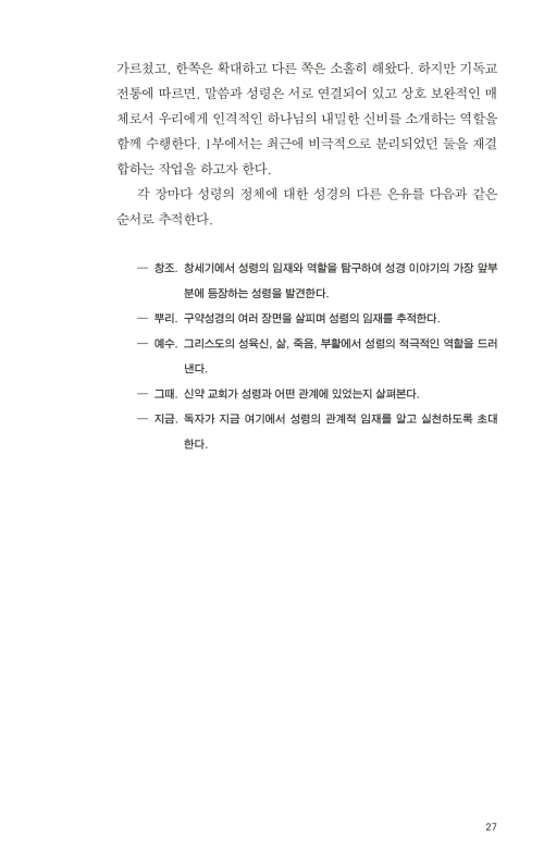 그 여정에서 독자는 성령의 인격과 임재, 역할을 드러내는 성경의 핵심 이미지와 은유를 깊이 탐구하고, 성령께로부터 오는 능력과 충만함을 가로막는 흔한 오해들을 교정하게 된다. 또한 실제적이고 건강한 실천 모델을 배우며, 성령께서 어떻게 분별력을 주시고 우리를 하나님의 일에 동참하는 기적의 통로로 빚어가시는지 발견하게 된다. 무엇보다 종종 분리되어 온 ‘말씀’과 ‘성령’이 어떻게 함께 역사하여 하나님을 더욱 생생하고 친밀하게 드러내는지 이해하게 된다.