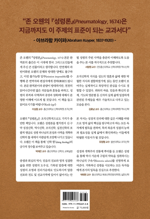 성령에 관한 오웬의 탁월한 저술인 본서를 이해하기 쉽고 매끄럽게 번역하신 서문 강 목사님의 신학적 통찰력, 충만한 열정과 사랑, 그리고 땀 흘리신 수고에 감사드리며, 거룩하신 성령을 사모하는 모든 독자들에게 본서의 일독을 진심으로 추천한다.