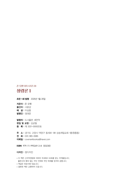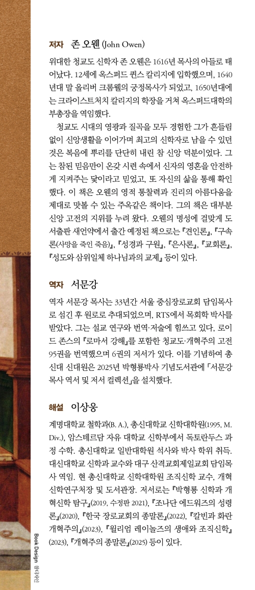 오늘날 다양한 신학적 담론 속에서 성령님의 사역을 재고하려는 모든 독자에게, 오웬의 『성령론』은 신학과 실천이 어떻게 하나가 될 수 있는지를 보여주는 모범이 될 것입니다. 오웬은 본서를 통해 우리를 사변적 논쟁이 아닌, 삼위 하나님과의 교제 속으로 초청합니다. 아무쪼록 이 귀한 완역본을 통해 한국 교회가 성령 하나님에 대한 더 깊고 정통한 신학, 그리고 그분 안에서 누리는 더 풍성한 위로와 능력을 회복하게 되기를 기대합니다.