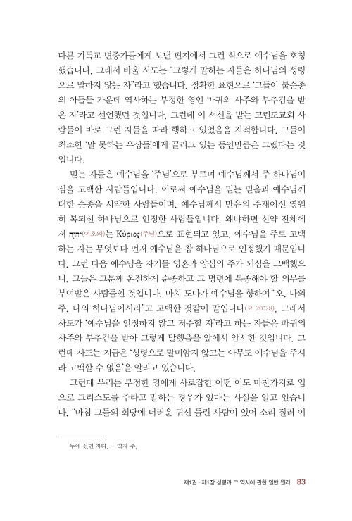 존 오웬의 『성령론』(Pneumatology, 1674) 본문 완역본의 출간은 이 시대에 한국 그리스도인들에게 주신 큰 선물이라고 생각합니다. 만연체의 라틴어화된 오웬의 문체와 방대한 양에도 불구하고, 이런 불가능한 임무(mission impossible)를 수행해 준 번역자와 편집자에게 찬하(攢賀)드립니다. 본문 완역본이라 분량이 방대하지만, 천천히 읽어 나간다면 많은 의문들과 혼동을 파하고, 성령의 위격과 사역(특히 중생과 성화)에 대해서 분명한 이해에 이르게 될 것입니다. 이 책을 들고 읽어 보시기를 바랍니다(tolle lege!)
