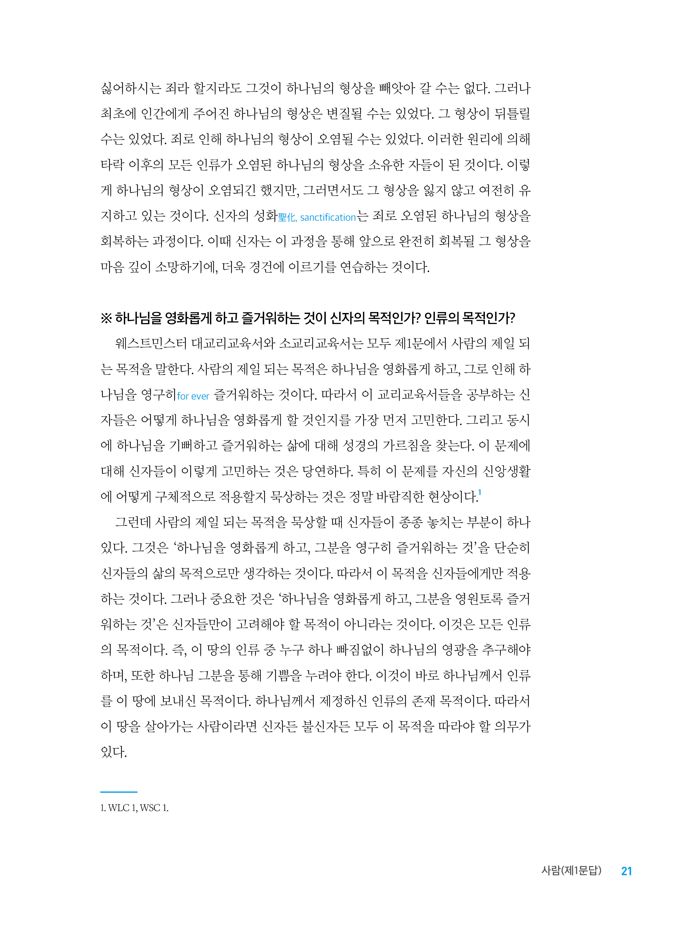 - end ‘목적’이라는 뜻이다. 그런데 이는 추구하고 지향해야 할 방향을 말하는 aim이나, 도전하고 성취해야 할 목표치를 말하는 goal과 다르다. end는 끝을 강조하는 표현으로 우리가 도달하게 되는 최종 목적지를 의미한다. 즉, end는 인간에 대한 하나님의 이 목적이 우리가 추구하거나, 성취해야 하는 목적이 아니라, 하나님께서 자기의 백성들을 인도하셔서 도달하게 하시는 최종 목적지라는 것을 잘 드러낸다.