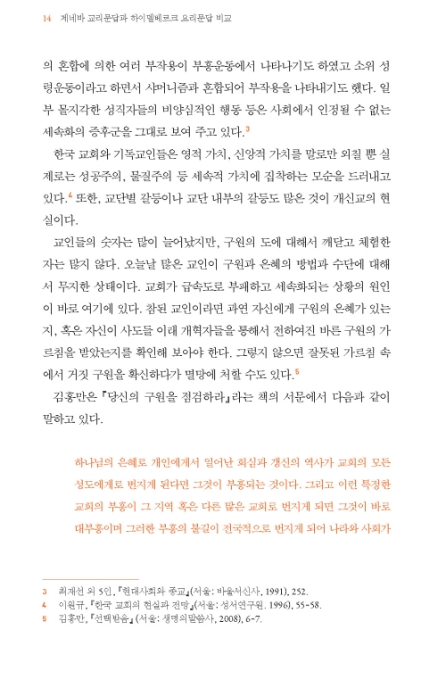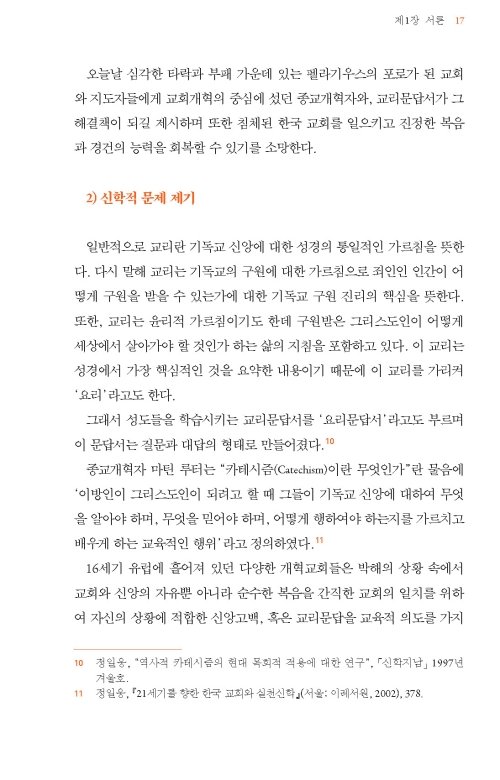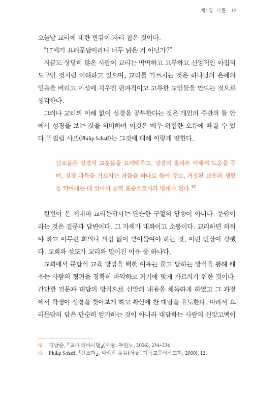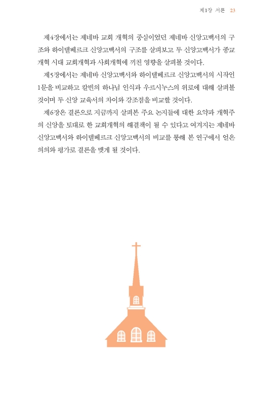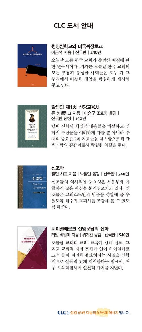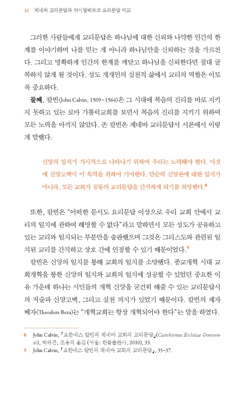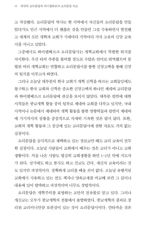 교리 교육의 모범이 되는 칼빈의 제네바 교리문답과 하이델벨크 요리문답을 비교 연구하였고 이 책이 위기 속에 있는 한국 교회의 뼈대를 굳건히 하는데 도움이 된다.