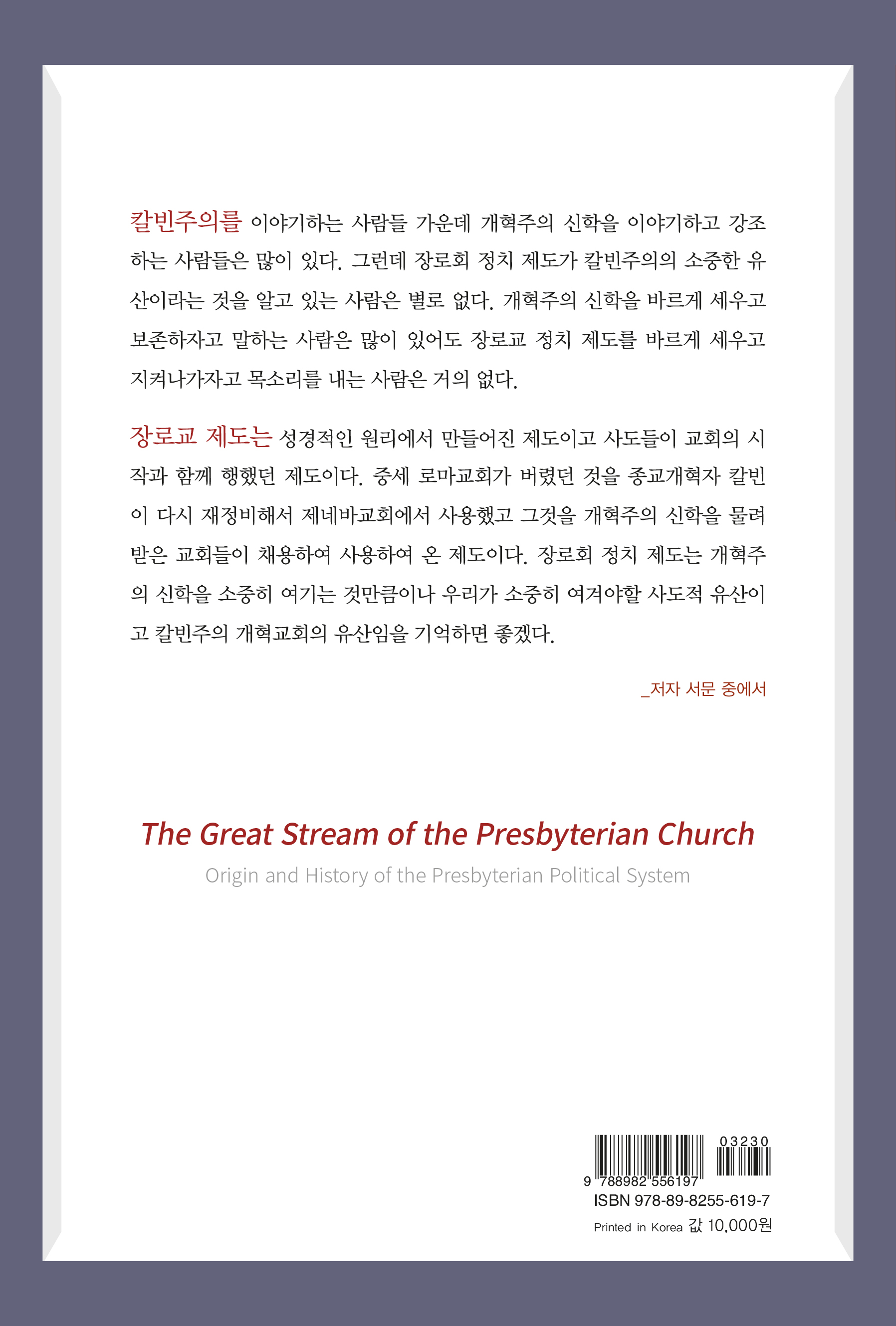 진지훈 박사가 심혈을 기울인 연구의 산물인 “장로교회의 큰 물줄기”에 깊은 경이로움을 느낍니다. 진지훈 박사는 미국에 유학해 칼빈 신학교에서 장로회 정치 제도와 역사를 공부한 장로회 정치 제도의 전문가입니다. 그 뿐 아니라 장로교 헌법의 원류가 되는 종교개혁자 칼빈의 16세기 제네바교회 헌법과 그의 성경주석을 비교 연구하는 논문으로 박사 학위를 받은 정통 개혁주의 칼빈학자입니다. 더욱이 이 책은 평소 학자로서의 소신과 통찰력 있는 필력이 고스란히 묻어있어서 장로회 정치 제도의 기원과 역사에 대해서 재미있게 접근할 수 있게 합니다. 이 책을 읽는 독자들이 장로회 정치 제도에 대해서 더 많은 이해를 갖게 될 것이라 기대합니다. 발간을 축하드리며 이 책이 이 땅의 모든 장로교회 성도들에게 명쾌하고 시원한 활력소가 되기를 소망합니다.