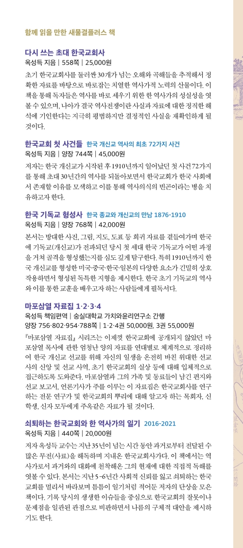 종교개혁의 한 원리가 “오직 성경만으로”이지만, 지난 2,000년간 하나님께서 일하신 이야기는 교회사를 공부해야 알 수 있고, 지난 500년 이상 하나님이 한반도에서 사람들을 통해 하신 놀라운 일은 한국교회사 자료를 읽고 정리해야 알 수 있다. 이 책에는 외국에서 일어난 예화가 아니라 한반도에서 한국인이 경험한 실화를 모았다. 우리는 그 전체 이야기의 일부다. 우리가 어디서 와서, 현재 어디에 있으며, 앞으로 어디로 가야 하는지를 알기 위해서는 그 전체 이야기를 보아야 한다. 한 손에 성경을, 다른 한 손에는 한국교회사 이야기를 들고 새로운 이야기를 만들어가자.