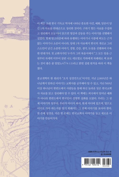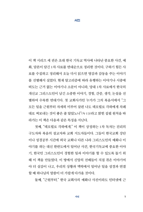 이 책은 초대 한국 기독교 역사에 나타난 중요한 사건, 예화, 담론이 담긴 1차 사료를 연대순으로 정리한 것이다. 구하기 힘든 사료를 수집하고 정리해서 오늘 다시 읽으면 영감과 감동을 주는 이야기를 선별해서 실었다. 현재 알고리즘에 따라 유행하는 이야기나 시중에 떠도는 근거 없는 이야기나 소문이 아니라, 당대 1차 사료에서 한국의 개신교 그리스도인이 남긴 소중한 이야기, 경험, 간증, 생각, 논설을 선별하여 수록한 연대기다. 첫 교회사가인 누가가 그의 복음서에서 “그 모든 일을 근원부터 자세히 미루어 살핀 나도 데오빌로 각하에게 차례대로 써 보내는 것이 좋은 줄 알았노니”(눅 1:3)라고 밝힌 집필 원칙을 따라 이 책을 썼다.