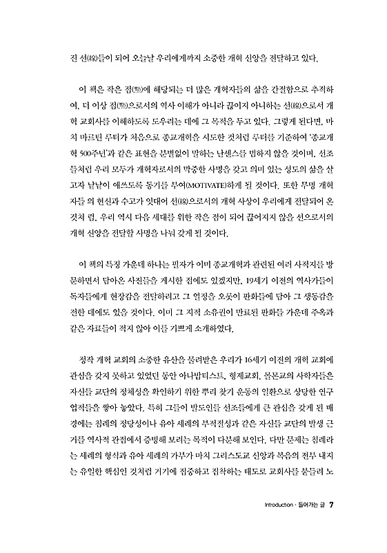 이 책은 작은 점()에 해당되는 더 많은 개혁자들의 삶을 간절함으로 추적하 여, 더 이상 점()으로서의 역사 이해가 아니라 끊이지 아니하는 선(線)으로서 개 혁 교회사를 이해하도록 도우려는 데에 그 목적을 두고 있다. 그렇게 된다면, 마 치 마르틴 루터가 처음으로 종교개혁을 시도한 것처럼 루터를 기준하여 ‘종교개 혁 500주년’과 같은 표현을 분별없이 말하는 난센스를 범하지 않을 것이며, 선조 들처럼 우리 모두가 개혁자로서의 막중한 사명을 갖고 의미 있는 성도의 삶을 살 고자 낱낱이 애쓰도록 동기를 부여(motivate)하게 될 것이다. 또한 무명 개혁자들 의 헌신과 수고가 잇대어 선(線)으로서의 개혁 사상이 우리에게 전달되어 온 것처 럼, 우리 역시 다음 세대를 위한 작은 점이 되어 끊어지지 않을 선으로서의 개혁 신앙을 전달할 사명을 나눠 갖게 될 것이다.