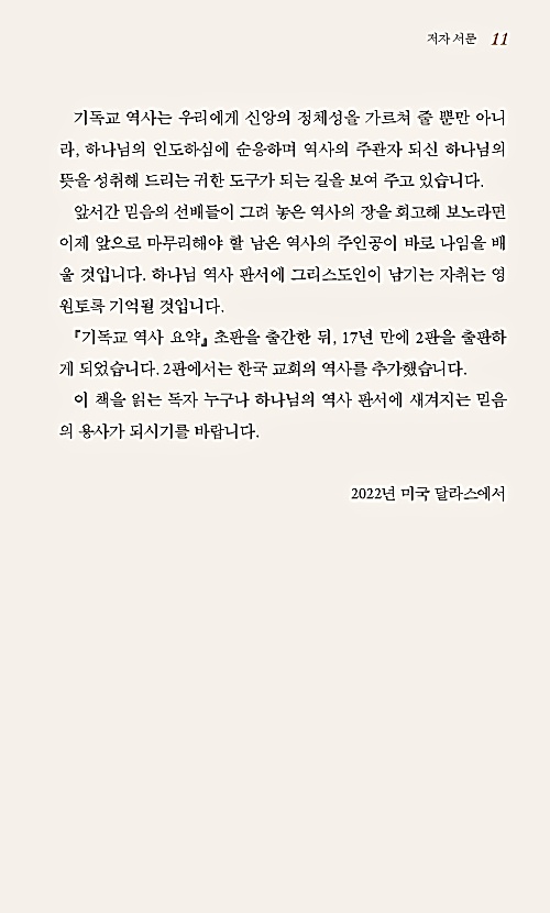 세계 기독교 역사를 일목요연하게 정리해 앞서 출간한 『기독교 역사 요약』에 한국 기독교 역사를 추가한 개정판이다. 초대 교회부터 19세기 유럽과 북미 기독교 역사의 굵직한 사건들을 중심으로 기독교 역사의 큰 흐름을 서술하고, 한국 선교의 시작부터 한국 교회의 성장과 분열의 역사 그리고 사명까지 기술했다. 마지막 두 장에서는 고대와 초대 교회 이전의 구약사도 정리했다. 저자는 기독교 역사를 살펴보며 신앙의 정체성뿐 아니라 하나님의 뜻을 역사 속에서 이루는 도구가 되는 길을 배울 수 있고, 하나님의 역사 판서에 그리스도인으로서 자취를 남길 수 있다고 말한다. 또한, 한국 교회가 아시아는 물론 전 세계를 향한 선교의 중심으로 떠오르기 때문에 한국 기독교 역사를 아는 것이 중요하다고 말한다. 이런 동기로 『기독교 역사 요약』을 다시 한번 다듬고 보완해 냈다.