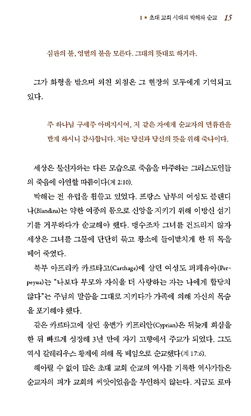 그때 기독교 성경의 오래된 사본들이 대부분 유실되었다. 수천 교회가 파괴되고 그 자리에 이슬람교 성당이 세워졌다. 한때 어거스틴과 키리피안(Cypirian)의 수고로 세워진 북부 아프리카 교회 성도들의 깊은 영성의 자취는 순식간에 멸망되어 아무런 흔적조차 남기지 않았다.-p.34