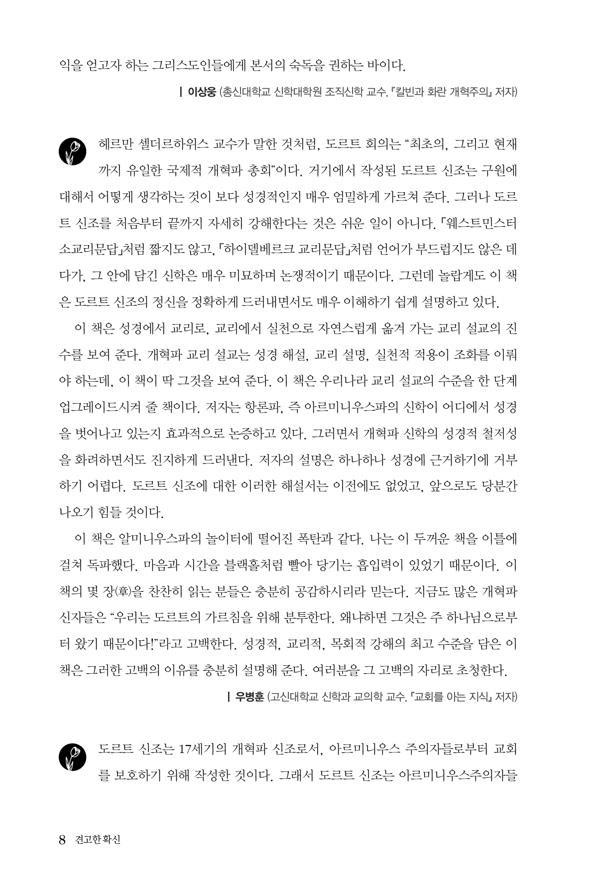 도르트 신조가 미국은 물론 네덜란드 교회에서조차도 별 관심을 받지 못하고 있는 상황에서 윤석준 목사가 상당 기간 이 신조를 교회에서 특히 공적 신앙고백을 준비하는 자녀들에게 가르치고 그 결실을 책으로 출판하여 우리를 기쁘게 하는 쾌거를 이루었다. 이미 윤 목사는 하이델베르크 요리문답도 해설하고 출판하였는데, 그가 개혁 신앙과 신학에 고백적으로 천착한 이력이 깊다. 더구나 한국 교회의 저변에 흐르고 있는 아르미니우스주의와 그 영향력이 엄청난 상황에서, 본서는 한국 교회를 다시 성경 말씀과 그 교리의 터 위에 든든하게 세워 더욱더 건강하게 만들 수 있을 것이다.