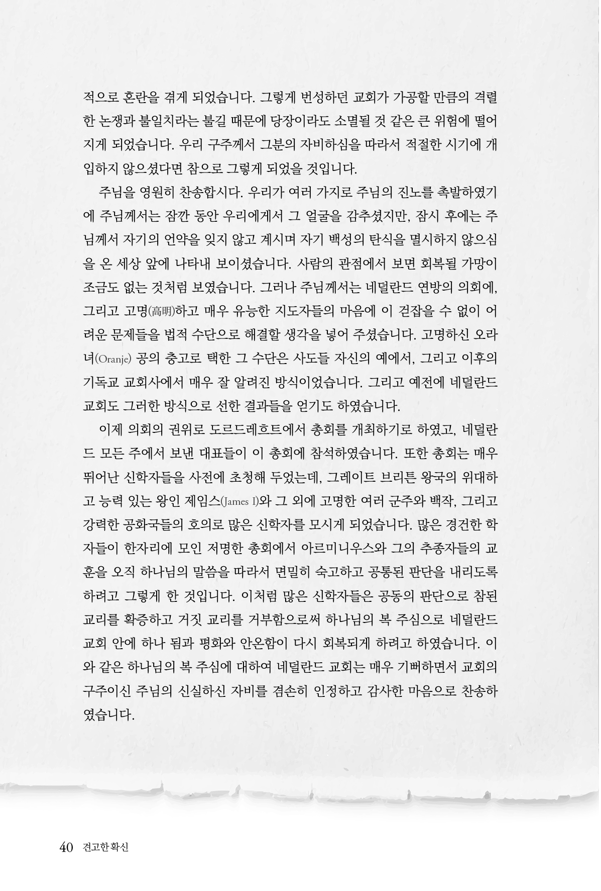 한국 장로교회는 웨스트민스터 표준 문서들(1640년대)을 신앙과 신학 함의 표준으로 삼는다면, 유럽의 개혁 교회(특히 네덜란드 개혁 교회)는 〈벨직 신앙고백〉(1561), 〈하이델베르크 요리문답〉(1563)과 더불어 〈도르트 신조〉(1619) 등의 3대 문서를 “교회의 일치를 위한 3대 신앙 문서(Three Forms of Unity)”로 수용하고 여러 방식으로 가르쳐 왔다. 최근 10여 년 사이 국내에서 이 “교회의 일치를 위한 3대 신앙 문서(Three Forms of Unity)”에 대한 관심이 많아지고, 관련 해설서들이 여러 가지로 출간되어 성도들에게 유익을 끼치고 있는 것은 대단히 고무적인 현상이다. 국내에도 도르트 신조와 관련한 몇몇 책들이 출간되어 있지만, 이번에 출간되는 『견고한 확신: 도르트 신조 강해의 정석』은 비교 불가능한 가치를 가진 대작(masterpiece)이다.