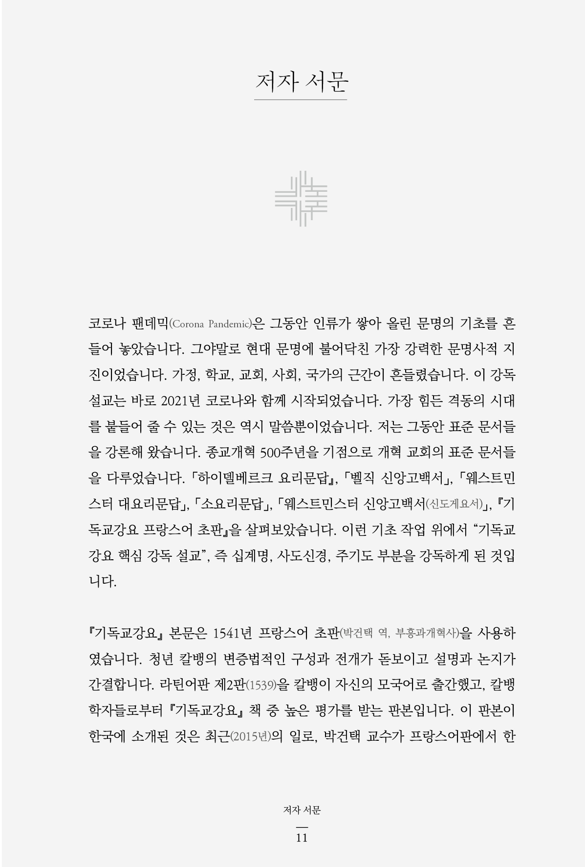 코로나 팬데믹(Corona Pandemic)은 그동안 인류가 쌓아 올린 문명의 기초를 흔들어 놓았습니다. 그야말로 현대 문명에 불어닥친 가장 강력한 문명사적 지진이었습니다. 가정, 학교, 교회, 사회, 국가의 근간이 흔들렸습니다. 이 강독 설교는 바로 2021년 코로나와 함께 시작되었습니다. 가장 힘든 격동의 시대를 붙들어 줄 수 있는 것은 역시 말씀뿐이었습니다. 저는 그동안 표준 문서들을 강론해 왔습니다. 종교개혁 500주년을 기점으로 개혁 교회의 표준 문서들을 다루었습니다. 「하이델베르크 요리문답』, 「벨직 신앙고백서」, 「웨스트민스터 대요리문답」, 「소요리문답」, 「웨스트민스터 신앙고백서(신도게요서)」, 『기독교강요 프랑스어 초판』을 살펴보았습니다. 이런 기초 작업 위에서 “기독교강요 핵심 강독 설교”, 즉 십계명, 사도신경, 주기도 부분을 강독하게 된 것입니다.