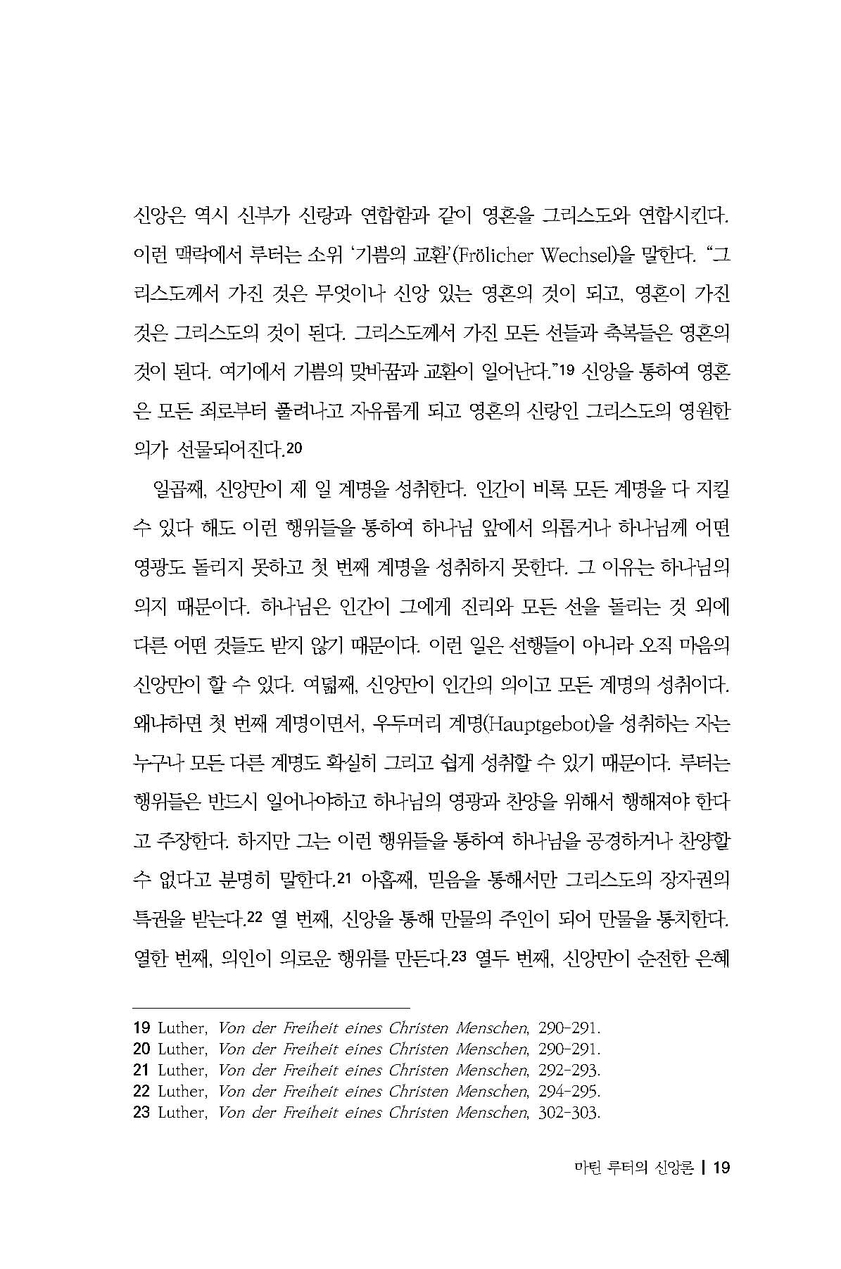 “믿음의 교리”, 즉 신앙론은 종교개혁의 핵심이자 본질이다. 공로가 아닌 믿음을 칭의의 유일한 근거라고 주장한 마르틴 루터의 선언으로 “종교개혁”이라는 역사적 대전환이 발생할 수 있었기 때문이다. 그래서 “오직 믿음으로”(Sola fide) 라는 구호가 종교개혁을 대변하는 원리가 된 것이다. 이 구호의 근거는 마르틴 루터가 번역한 독일어성경 로마서 3장 28절인데, 그는 그 구절을 다음과 같이 번역한다.