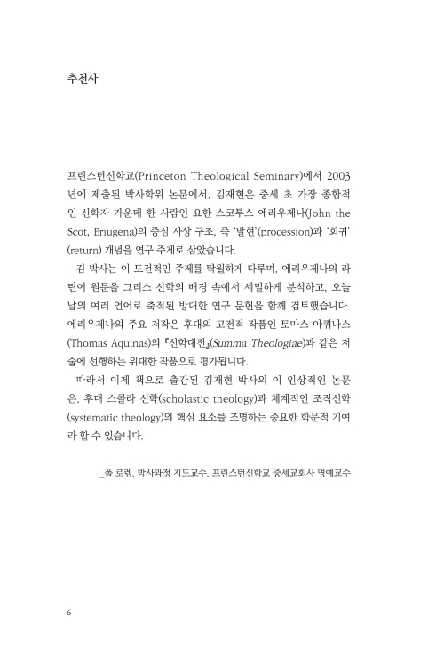 이 책은 필자가 2003년 프린스턴신학교에 제출한 철학박사 학위논문을 한글로 풀어 보완한 것이다. 여기서 샤를마뉴 대제에 의해 촉발된 이른바 카롤링거 르네상스 시대에 기독교의 발전을 가장 잘 보여 준 인물 중 한 명인 요한 스코투스 에리우제나의 신학을 집중적으로 조명하였다.