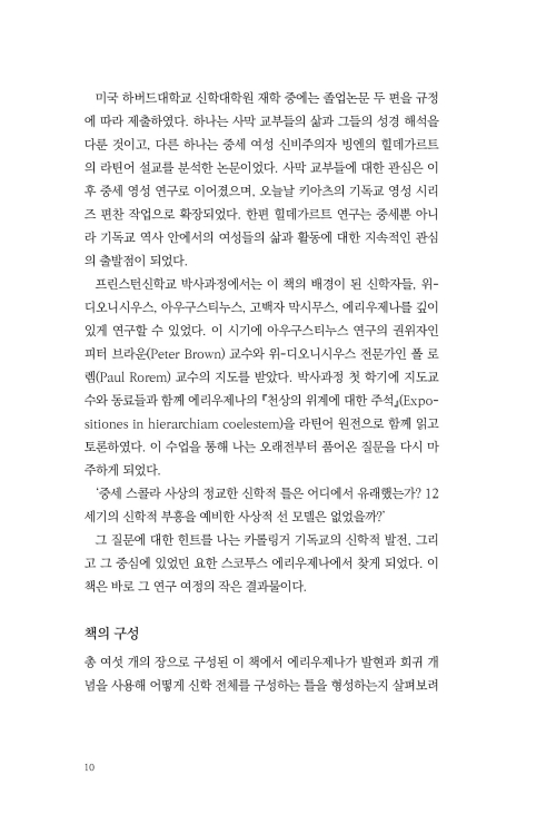 기독교 2천 년의 역사에서 아우구스티누스로부터 종교 개혁에 이르는 천 년의 시기를 건너뛴 채 기독교를 이해할 수는 없다. 중세 기독교는 아우구스티누스 전통과 더불어 위-디오니우스 전통이 두 축을 이루어 발전해 왔음에도 한국에서는 후자에 대한 이해가 상대적으로 빈약하다. 이 책은 위-디오니시우스와 막시무스의 사상을 소개하고, 이를 통합한 에리우제나의 신학을 분석함으로써, 아우구스티누스와 나란히 중세 신학을 구성한 또 하나의 계보를 선명하게 드러낸다.