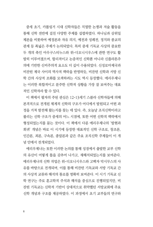 저자는 오늘날 ‘조직신학’이라고 불리는 신학 구조가 중세의 어느 시점에, 어떤 신학적 맥락에서 형성되었는지를 탐구하며, 에리우제나의 ‘발현’과 ‘회귀’ 개념이 바로 이 시기에 등장한 대표적 신학 구조라고 주장한다. 그는 창조론, 인간론, 죄론, 구속론, 종말론 같은 주요 조직신학 주제가 발현과 회귀 개념 안에서 유기적으로 전개된다고 설명한다.