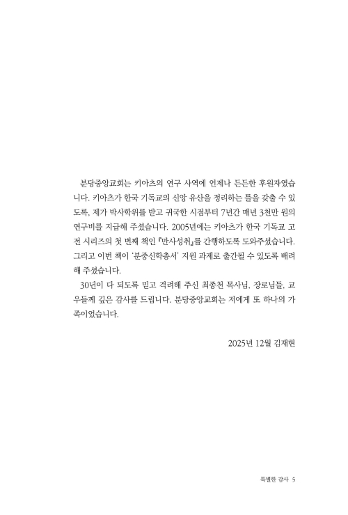 프린스턴신학교(Princeton Theological Seminary)에서 2003년에 제출된 박사학위 논문에서, 김재현은 중세 초 가장 종합적인 신학자 가운데 한 사람인 요한 스코투스 에리우제나(John the Scot, Eriugena)의 중심 사상 구조, 즉 ‘발현’(procession)과 ‘회귀’ (return) 개념을 연구 주제로 삼았습니다. 김 박사는 이 도전적인 주제를 탁월하게 다루며, 에리우제나의 라틴어 원문을 그리스 신학의 배경 속에서 세밀하게 분석하고, 오늘날의 여러 언어로 축적된 방대한 연구 문헌을 함께 검토했습니다. 에리우제나의 주요 저작은 후대의 고전적 작품인 토마스 아퀴나스(Thomas Aquinas)의 『신학대전』(Summa Theologiae)과 같은 저술에 선행하는 위대한 작품으로 평가됩니다. 따라서 이제 책으로 출간된 김재현 박사의 이 인상적인 논문은, 후대 스콜라 신학(scholastic theology)과 체계적인 조직신학 (systematic theology)의 핵심 요소를 조명하는 중요한 학문적 기여라 할 수 있습니다.
