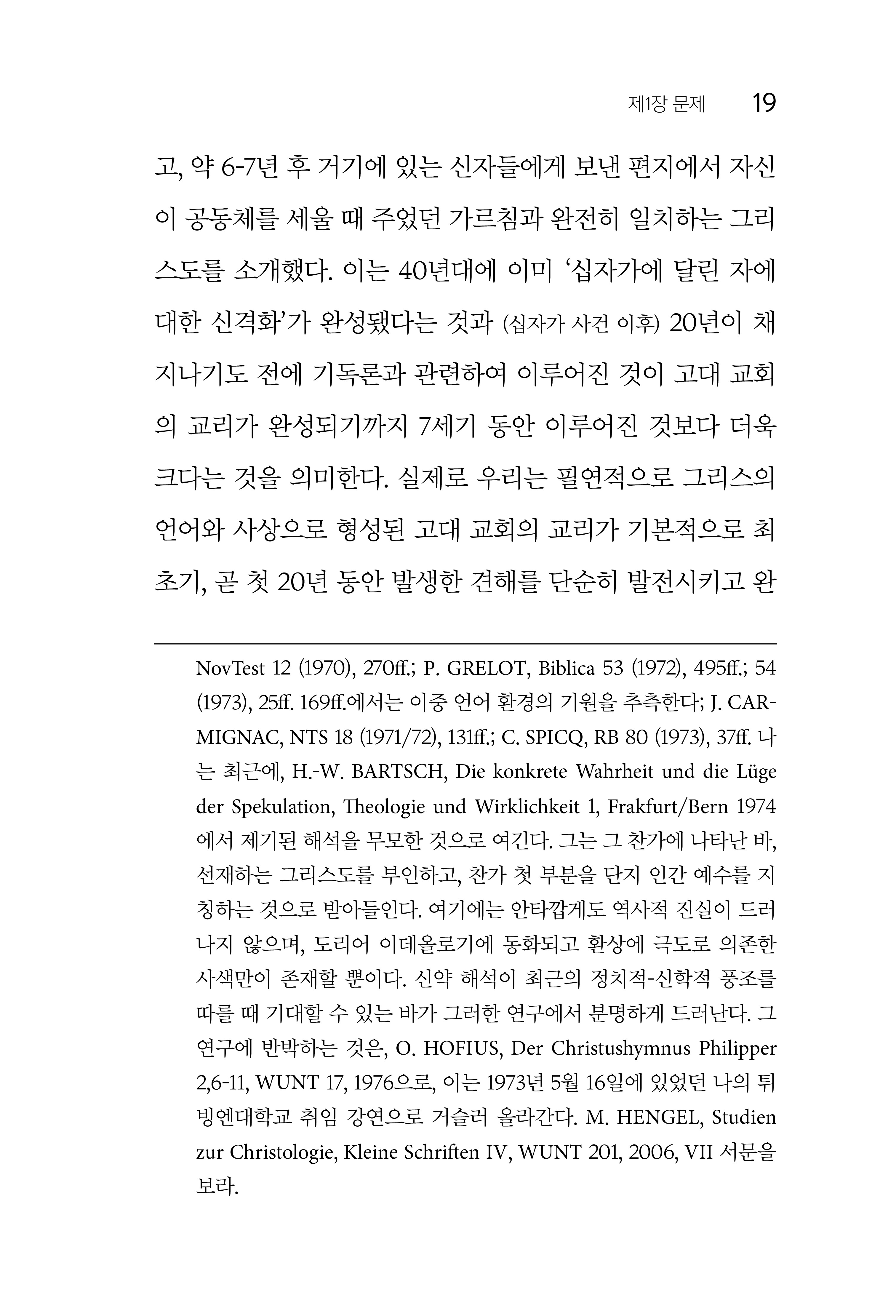 “이 책은 오늘날 뚜렷한 논쟁의 장이 되어 온 신약 기독론에 관한 비판적인 논의에 기여하도록 의도됐습니다. 저는 역사적인 학문과 신학적인―어떤 이들은 ‘교리적’이라고 부를―물음이 서로 풀 수 없는 모순 상태에 있어서는 안 된다는 점을 입증하는 데 관심을 가지고 있습니다. 신약 기독론의 신학적인 경향과 그 내적 일관성을 파악하지 못할 경우 역사가는 신약 기독론의 본질을 오해하게 되고, 최초기 기독교의 수십 년간의 기독론의 역사적 과정을 진지하게 고려하지 않은 교리적 접근은 고작 추상적인 사변으로 전락할 위험을 안고 있습니다. 역사 실증주의와 해석학적 관심이 신약학에서 대개 각자의 길을 가고 있는 이 시기에 역사적인 연구와 진리에 대한 신학적 탐구를 재결합하는 것은 대단히 중요합니다.” — 서문 중
