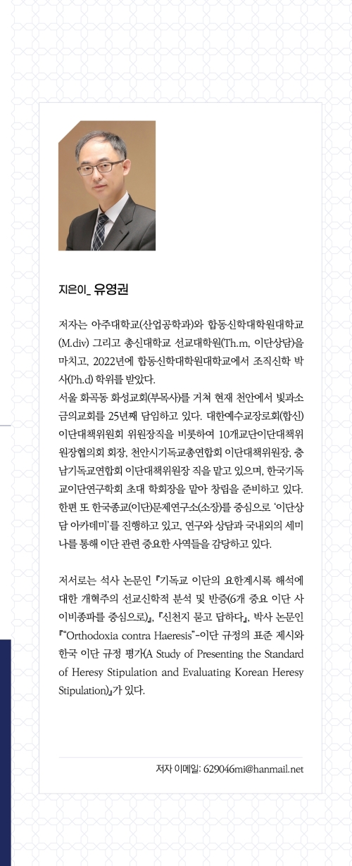 한국의 이단 현황은 매우 복잡하다. 신천지, 베뢰아, JMS 등은 쇠락의 길을 걷고 있고, 한편 안증회 같은 이단들은 오히려 활동력이 더 커지지 않을까 하는 염려를 갖게 한다. 이단이 쇠락한다고 하여 완전히 사라지는 것도 아니며, 여전히 왕성하다고 하여 끝이 없다는 것도 아니다. 쇠락하더라도 더 큰 파생 집단이 일어날 수 있고, 끝이 없는 듯하나 순간에 무너지기도 하기 때문이다. 따라서 교회의 대처가 더욱 중요한 시기이다. 교회가 이단을 바르게 알고 강력한 대처를 하여야 하는 이유이다. 이러한 때에 꼭 필요한 책으로서 저자의 책은 첫판을 통해서 교회에 큰 유익을 주었고, 이제 다시 데이터 등을 수정하여 개정판을 내놓았다. 저자는 한국기독교가 100여 년 동안 규정한 이단, 사이비 및 문제의 단체들을 현미경으로 들여다보듯 세밀하게 살폈다. 저자의 뼈를 깎는 듯한 노고로 독자들은 일목요연한 도표와 리스트로 쉽게 이단 규정의 역사를 볼 수 있게 됐다. 이 책에는 한국의 이단은 물론이고 부당하다고 항변할 수 있는 단체들도 포함됐다. 이는 규정의 기준이 저자에 있는 것이 아니라 총회에서 결정했느냐 안했느냐를 엄정한 잣대로 삼았기 때문이다. 따라서 이 책에는 누구나 이단이라고 할만한 곳도 있지만 신학적 정리가 필요한 문제단체들, 논란이 되는 단체들도 포함했고 그 규정에 대한 저자의 평가도 덧붙였다. 무엇보다도 이 책의 백미는 성경과 기독교 역사 속에 교회의 신앙문서들을 바탕으로 해서 이단을 규정할 때 기준이 될 표준을 제시한 부분이다. 또한 이렇게 제시한 표준에 근거하여 한국 교회가 이제까지 규정한 결정에 대한 당위성을 확인하였다는 것이다. 한국교회의 실제적인 이단 대처를 위한 저자는 치열하게 고민했다.