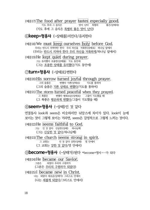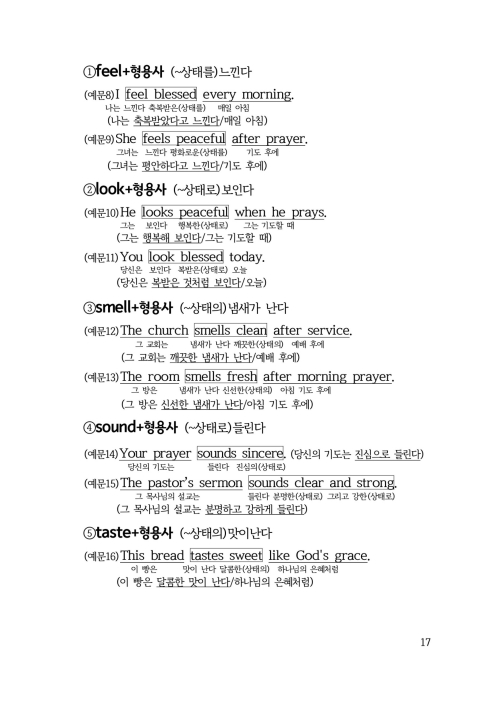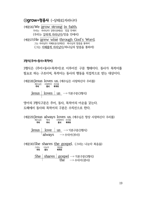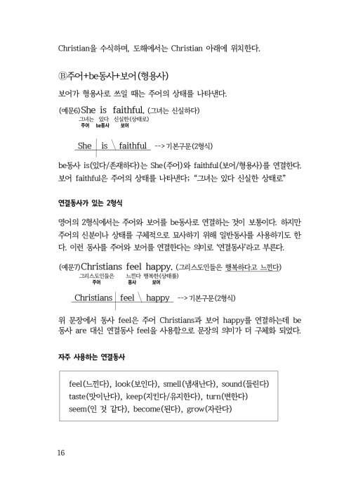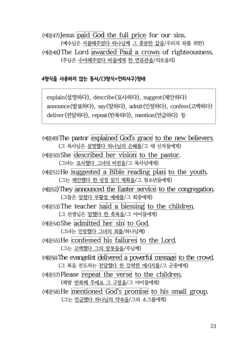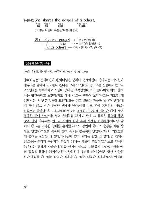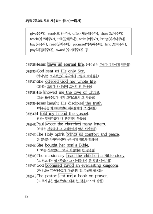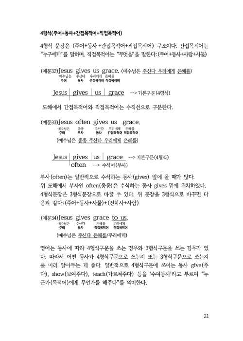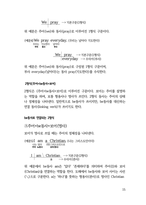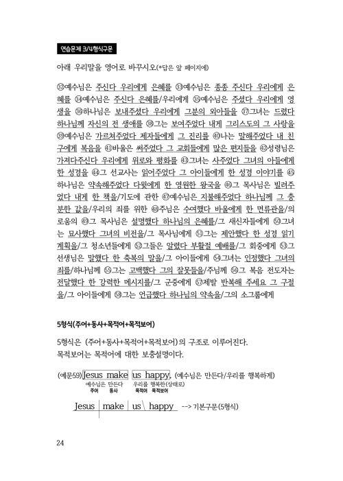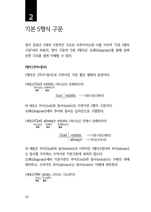 영문법 대신에 영어구문론을 사용하였고 모든 예문을 성경말씀이나 신앙적인 글을 사용하였다. 교회에서 영어성경공부에 사용하면 공부 때문에 교회 오기가 힘든 청소년들을 교회에 오게 할 수 있으며 영어와 영성 두 마리 토끼를 잡을 수 있다. 언어학자들은 한국인들이 오랜 기간 영어를 학습하면서도 영어를 잘하지 못하는 이유를 영어의 어순과 우리말 어순이 다르기 때문이라고 말한다. 완전히 뒤바뀐 어순 때문에 문장이 조금만 길어도 머리가 복잡해지고 이해가 안 된다. 지금껏 해온 단어와 문법 중심의 영어공부법의 한계이다. 영문법을 영어 구문론(syntax)로 바꾸어야 한다. 구문론(씬택스)은 2-3개의 단어가 어떻게 서로 연결되어 의미를 만들어내는가를 공부하는 언어습득 방법론이다. 씬택스로 영어를 공부하면 독해는 물론 말하기, 쓰기, 듣기를 모두 잘할 수 있다. 이 책은 영문법 전체를 구문론으로 설명하고 있으며 연습문제를 통해 복습과 훈련이 가능하도록 구성되어 있다. 이 책으로 공부하면 단 몇 달만에 영어실력이 크게 향상한 자신을 발견하게 될 것이다.
