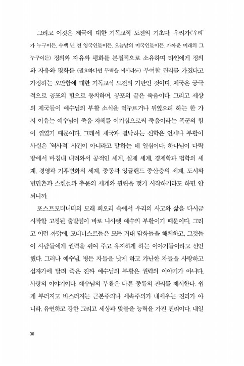 그 가운데 우리는 1세기 예수님과 빌라도와의 대화를 통해, 그리스도인이 세상 권력에게 어떤 이야기를 해야 하고, 무엇을 주장해야 하는지에 대한 통찰을 얻는다. 제국의 영향력을 확대하려는 세속 사회의 폭력적 방식과 가장 무력하고 어리석어 보이는 십자가의 사랑에 대한 극명한 대조는 오늘날 그리스도인이 어떤 상황에 처해 있는지를 상징적으로 보여 준다. 저자는 힘을 기반으로 한 세속 사회에 새로운 가치, 새로운 공동체를 추구하는 기독교의 복음이 여전히 유효하며 답이 될 수 있는지를 진지하게 고민하며 성찰한다.