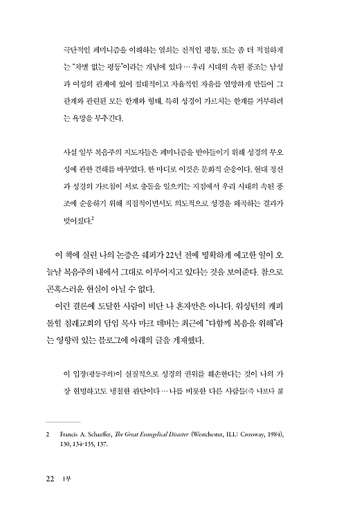 오늘날에도 복음주의 페미니즘을 통해 그와 똑같은 일이 일어나고 있다. 오늘날, 가정과 교회에서 남성이 차지하는 지도자적 역할을 거부하라는 엄청난 문화적 압력이 가해지고 있다. 이 사실을 확인하고 싶으면 아무 목회자나 붙들고 결혼과 교회에서 남성이 차지하는 지도자적 역할을 설교로 전하고, 가르치는 일이 즐겁냐고 물어보면 된다. 그런 주제를 다루기 원하는 목회자는 거의 없을 것이 틀림없다. 이것은 “논란이 너무 많은 주제”, 곧 온갖 반론을 자극하고, 많은 사람의 비위를 건드릴 만한 문제다. 문화적 풍조를 거스르기는 쉽지 않다. 그렇게 하기보다는 거기에 굴복해 여성들도 교회와 가정에서 남성들이 할 수 있는 일은 무엇이든 다 할 수 있다고 말하기가 훨씬 더 쉽다. -p.20