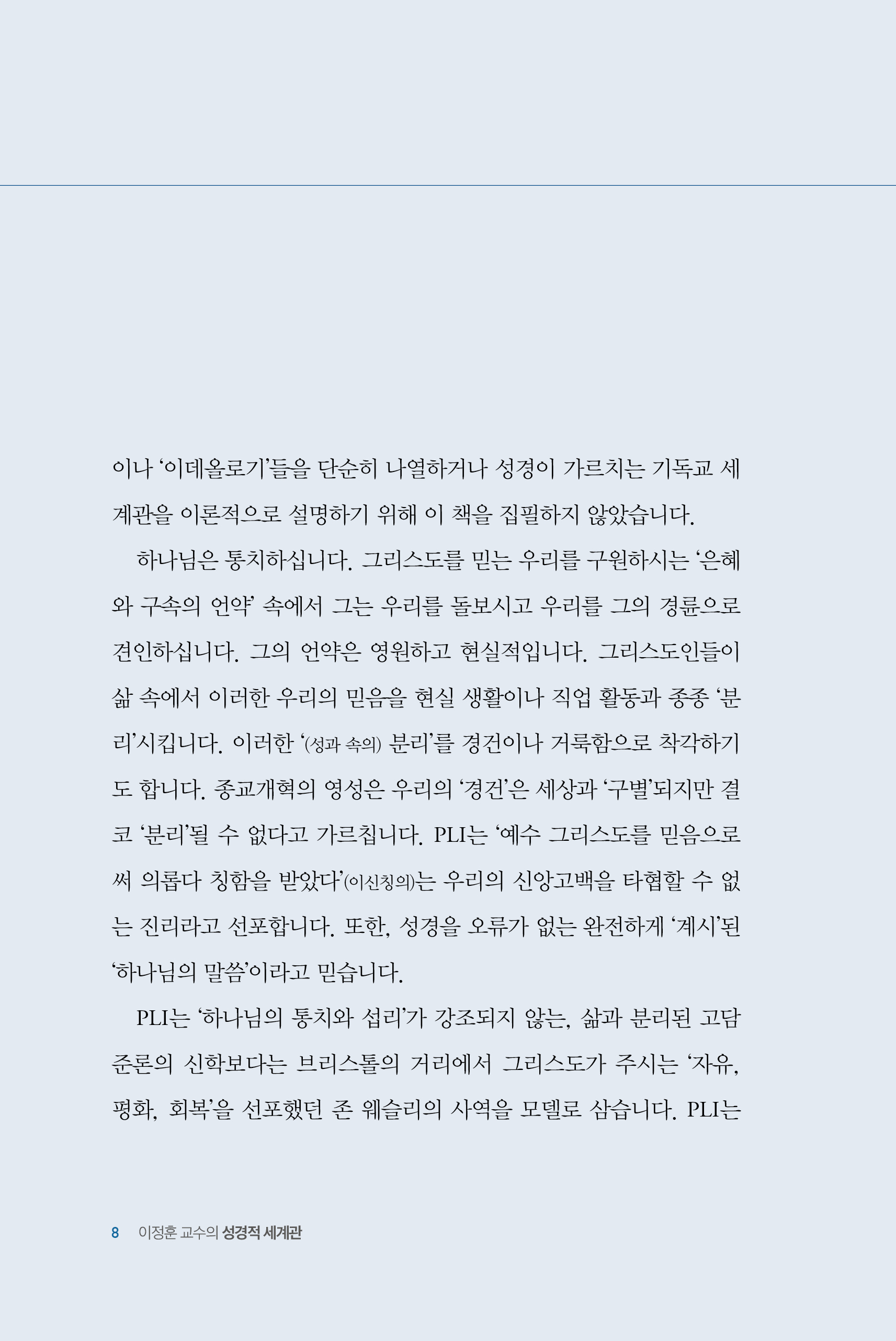 현실 속의 크리스천들이 겪는 이런 지적갈증과 어려움을 해소해 줄 구체적인 성경적 세계관 책을 출판하게 되어 뜻깊다. 『이정훈 교수의 성경적 세계관』은 기존의 추상적인 기독교 세계관 책들과는 달리 경제, 역사, 법·정치, 문화 등 세상의 영역들에 대한 구체적인 지식들과 그에 대한 성경적 적용점들을 제시한다. 인류역사를 통해서 실재했던 이야기들과 사상들, 인물들에 대한 저자의 방대한 내러티브에는 성경적이란 게 무엇인지에 대한 깊이 있는 통찰이 녹아있다. 각 영역에 해당되는 내용들을 읽으며 무엇이 성경적인 것인지 성찰하다 보면 어느 새 성경적 세계관으로 살아간다는 것이 무엇인지 체득하고 있는 자신을 발견할 것이다.