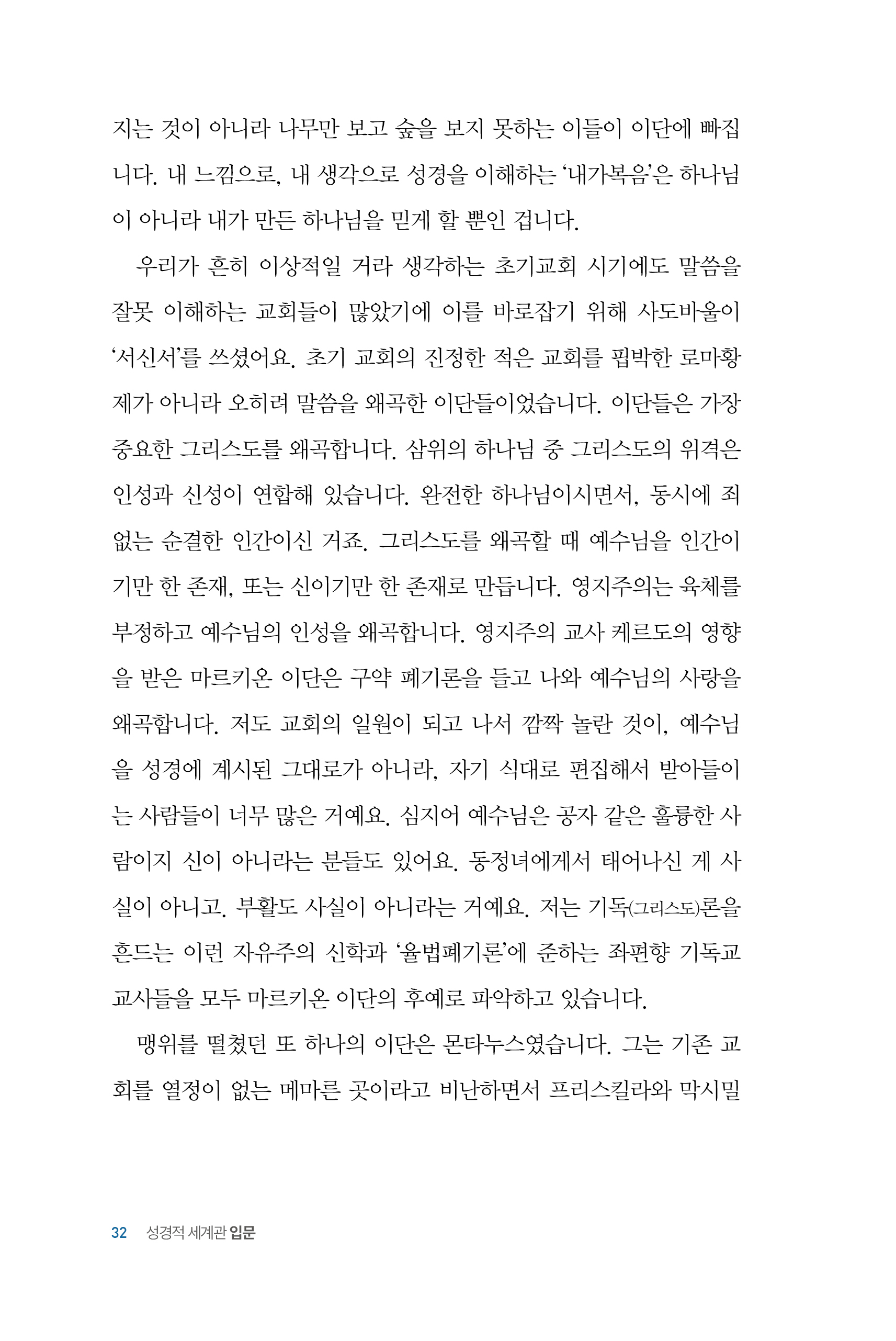 그런데 성경이 라틴어에서 쉽게 읽을 수 있는 자국어로 번역되었다고 해도 성경의 진리를 일관되게, 체계적으로 이해하기란 쉬운 일이 아니죠. 성경공부를 시도한 크리스천들이 대부분 경험하는 것처럼 성경을 왜곡하지 않으면서 제대로 이해하는 것은 무척 어려운 일입니다. 이단은 성경 외의 다른 것을 진리로 외치는 게 아니라 성경 안의 내용을 가져와서 왜곡한다는 걸 알아야 해요. 사단도 예수님을 시험할 때 성경말씀을 인용하지 않습니까? 예수님은 사단이 왜곡한 말씀의 참 뜻을 얘기하시면서 그 시험에서 승리하시죠(마 4:1-11). 예수님이 사단에게 시험받은 이 성경 말씀은 우리에게 성경을 어떻게 읽어야 하는지 알려줍니다. 성경은 전체 진리의 맥락 안에서 일관성(coherence)있게 이해되어야 합니다. 그래서 성경 진리의 요약이자 기준인 교리에 대한 정확한 이해가 필요합니다. 신론(삼위일체 하나님), 기독론(그리스도는 누구신가), 구원론(어떻게 구원을 얻는가), 성화론(어떻게 그리스도를 닮아 가는가)과 같은 핵심 교리들에 대한 바른 이해를 바탕으로 성경을 이해해야 바른 신앙을 가질 수가 있습니다. 특별히 악한 사람들이 이단에 빠지는 것이 아니라 나무만 보고 숲을 보지 못하는 이들이 이단에 빠집니다. 내 느낌으로, 내 생각으로 성경을 이해하는 ‘내가복음’은 하나님이 아니라 내가 만든 하나님을 믿게 할 뿐인 겁니다.