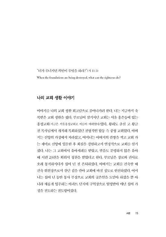 한국교회가 위기를 맞은 이유가 무엇일까? 역사신학을 전공한 이 책의 저자는 한국교회가 역사적 변동에 제대로 대처하지 못했기 때문이라고 생각한다. 역사적 변동을 고려하지 않는다면 위기의 원인을 둘러싼 분석은 단지 현상적이고 대처 방안들은 대증요법에 불과할 가능성이 크다. 저자가 보는 한국교회의 문제를 한 문장으로 요약하면 다음과 같다. 현재 대한민국에 존재하는 교회들은 크리스텐덤 시대에 형성된 교회들로서 새로운 시대에 적합하지 않기 때문에 교회의 형태와 습속, 더 나아가 메시지와 신학도 바뀌어야 한다.