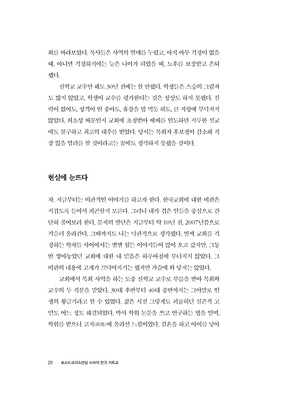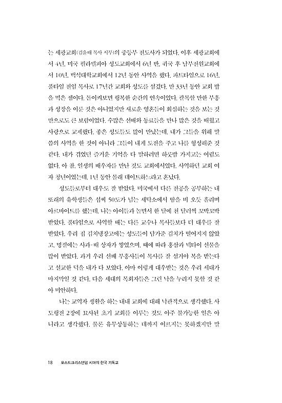 『포스트크리스텐덤 시대의 한국 기독교』는 21세기 한국교회에 대해 자칫 딱딱하게 접근할 위험을 가뿐히 넘어 저자의 개인적 서사와 함께 경험적이고 목회적인 애틋함을 느낄 수 있는 책이어서 방대한 듯하지만 잘 읽히는 책이다. 특히 서구 크리스텐덤에 대한 교회사적인 통찰에 덧붙여 한국교회의 유사 크리스텐덤 현상에 대한 저자의 분석은 우리에게 매우 큰 도움을 준다.