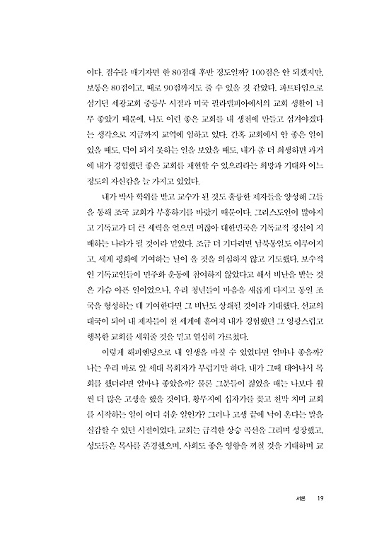 저자는 과거 유사 크리스텐덤의 영광을 추억하고 그리로 돌아가려는 시도를 그리 달가워하지 않는다. 오늘날 가라지 투성이의 교회가 있는 것은 바로 그 좋았던 옛 시절에 뿌려진 악의 씨앗이 자라난 결과라고 믿기 때문이다. 따라서 과거의 영화를 재현하려는 것이 아니라 현실을 받아들이고, 새로운 미래를 소망하며 눈물로 씨를 뿌리는 마음으로 이 책을 썼다고 고백한다. 역사신학에 탄탄한 기반을 두고 선교신학, 종교사회학, 목회 현장 경험을 두루 아우르는 이 책은 제임스 헌터가 쓴 『기독교는 어떻게 세상을 변화시킬 수 있는가』의 한국판 버전과 같은 지위를 갖게 될 것이다. 한국교회의 과거와 현재를 바로 이해하고, 이를 토대로 미래의 방향을 찾고자 하는 목회자들과 신학생들에게 특히 강력히 추천한다.