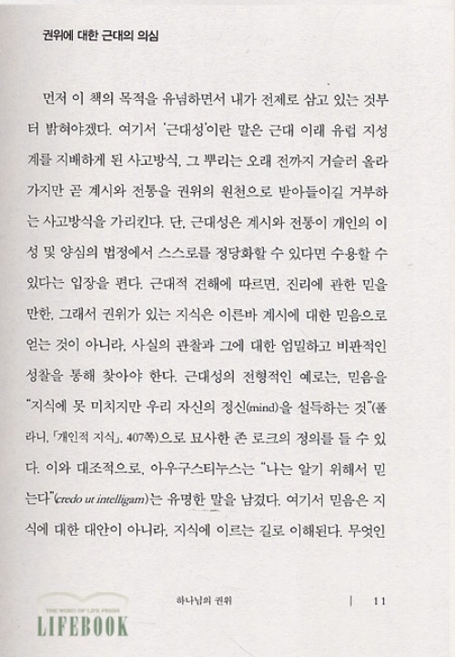 레슬리 뉴비긴은 탄탄하면서도 번뜩이는 논리로, 현대와 탈현대사회에서 진리와 권위의 원천을 분석하고 있다. 그는 근대가 이성이라는 환상을 가지고 권위에 관한 모든 주장을 의심하고 있음을 간파한다. 그는 교회가 성경, 전통, 이성, 경험을 신적 권위에 대한 근거로 제시할 수 있다고 주장한다. 무엇보다 저자는 이 네 가지가 각각 어떻게 신적 권위의 근거가 될 수 있는지를 설명하고 권위의 근거로서 각각의 올바른 관계를 정립해준다. 저자는 그리스도인들이 결국 성경을 말하고 그 이야기의 일부분으로 제대로 살아갈 때에야 현대 사회에서 복음의 권위와 진리를 바르게 증거 할 수 있다고 강조한다.
