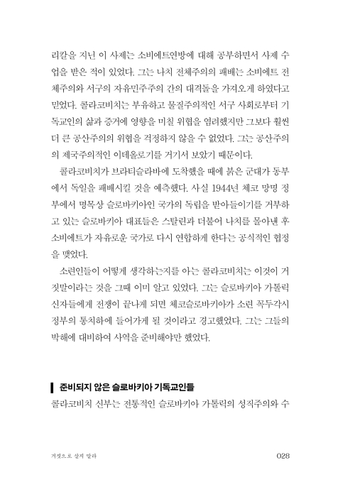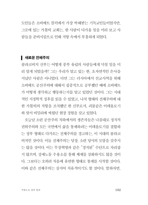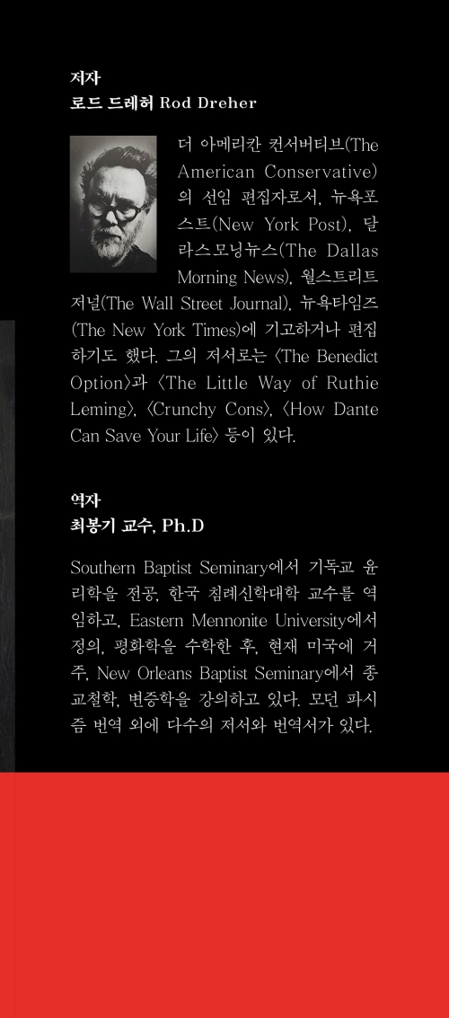 로드 드레허는 오늘날 우리가 직면한 전체주의가 노골적인 폭력보다는 심리적 조작에 더 기반을 두고 있다고 설명한다. 그는 소련의 박해에서 살아남은 기독교인들의 지혜와 함께 전체주의와 맞선 평범한 사람들, 성직자, 평신도, 순교자 들의 이야기를 들려준다. 이를 통해 우리는 우리 시대의 전체주의적 현실을 파악하고 저항하는 방법에 대한 실질적인 조언을 얻을 수 있다.