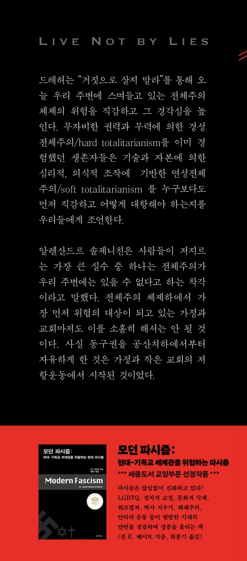 알렉산드르 솔제니친은 사람들이 저지르는 가장 큰 실수 중 하나는 자기 나라에서 전체주의가 일어날 수 없다고 생각하는 것이라고 말했다. 오늘날 많은 그리스도인들이 그러한 실수를 저지르고 있으며, 우리의 자유가 침식되는 것을 몽유병처럼 겪고 있다. 『거짓으로 살지 말라』는 그들을 일깨워 장기적인 저항을 준비시켜 줄 것이다.