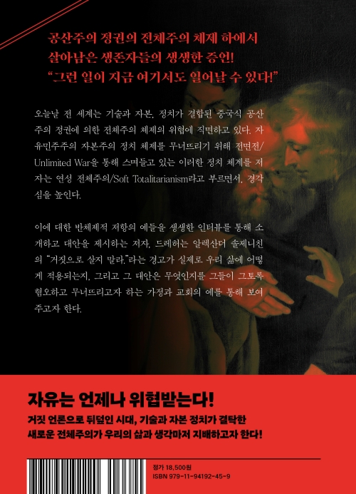 저자는 지금의 전체주의가 예전처럼 폭력을 앞세우는 대신, 심리적 압박과 조작으로 사람들을 길들인다고 설명한다. 이들의 경험은 오늘 우리가 어떤 방식으로 전체주의적 현실을 인식하고, 어떻게 저항해야 하는지에 대한 구체적이고 실질적인 조언이 된다. 또한 2차 세계대전 당시, 공산주의의 도래에 대비하도록 사람들을 이끌었던 한 예언자적 목회자의 모범을 따라, 이 책은 오늘의 기독교인들에게 진실을 지키는 저항의 길을 제안한다.