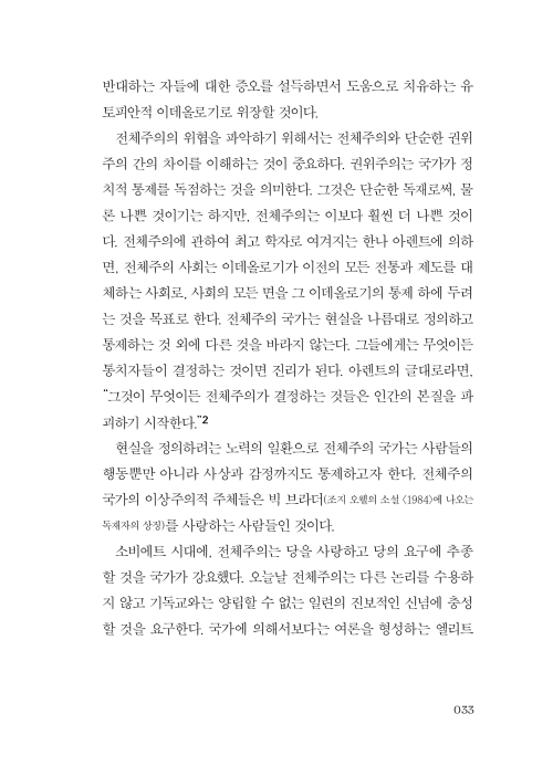 전체주의의 기초는 거짓에서 나온 이데올로기이다. 전체주의 체계는 거짓에 도전하는 것을 사람들이 두려워할 때에만 가능하다.