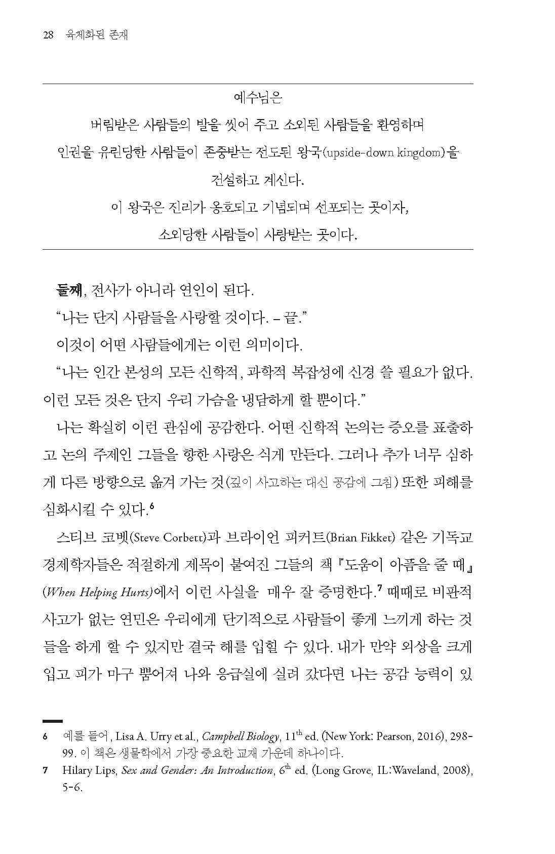 성경과 과학은 우리의 생물학적 성이 우리가 누구인지를 결정한다는 견해를 뒷받침하는 훨씬 더 많은 증거를 제공한다. 성별로 구분된 우리의 몸(sexed bodies)은 우리가 남성인지 여성인지 또는 둘 다인지를 결정한다. 또한, 육체화된 우리 몸(embodiment)은 우리가 이 세상에서 하나님의 형상을 어떻게 반영하는가에 있어서 필수적인 부분이다. 나는 성경이나 과학이 가령 우리가 부조화를 경험한다고 하더라도 우리의 젠더(정체성 또는 역할)가 성별로 구분된 우리의 정체성(sexed identity)을 지배한다고 제안할 만한 충분한 증거를 제공한다고 생각하지 않는다. 그러나 우리는 결코 사람이 가진 경험의 중요성이나 그들이 누구인지에 대한 그들의 내적 의식을 경시해서는 안 된다. 이것들은 우리가 숨 쉬는 공기보다 더 실제로 느껴질 수 있다. 내가 했던 이런 개념적 요점의 믿을 만한 적용은 이것을 이해해야 한다. 즉, 경험은 존재론적으로 우리가 누구인지 정의하지 않을 수도 있지만, 그래도 경험은 매우 실제적이고 중요하다는 것이다. 우리가 성경을 바르게 이해할 수는 있지만, 사랑을 잘못 이해하면 우리가 틀린 것이다.