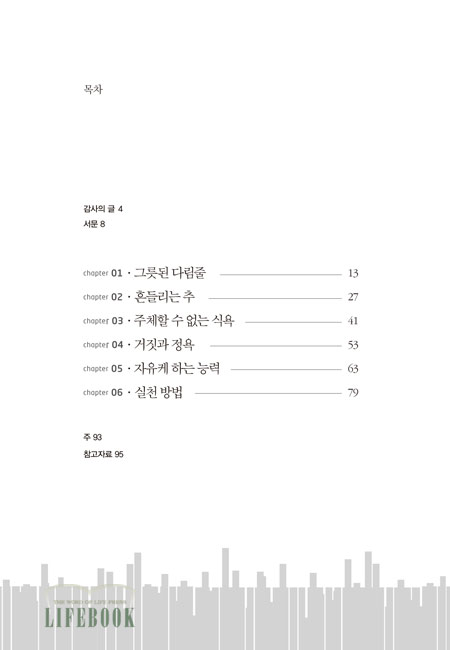 과 이별을 고하는 방법을 소개한다. 이 책을 통해 잘못된 다림줄인 ‘거짓 위로’에 속아 무너질 위기에 처해 있던 삶이, 올바른 다림줄인