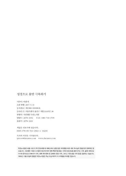성경 말씀이 독자에게 불안과 두려움을 이해하고 대처하는 데 힘 있게 적용될 수 있기를 바라는 마음에서 가능하면 성경 본문을 직접 인용했다. 번거롭게 여기지 말고 인용된 말씀을 읽고 묵상해 보길 바란다.