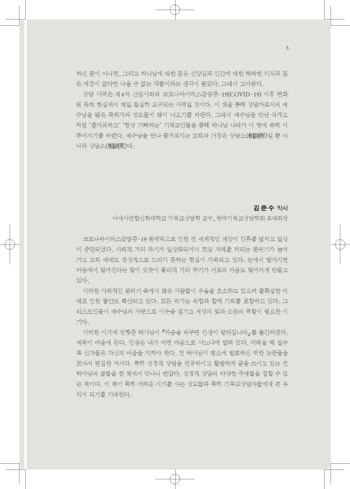 성경적 상담의 다양한 주제들을 접할 수 있는 책이다. 이 책이 특히 어려운 시기를 사는 성도들과 기독교 상담자들에게 큰 유익이 되기를 기대한다.