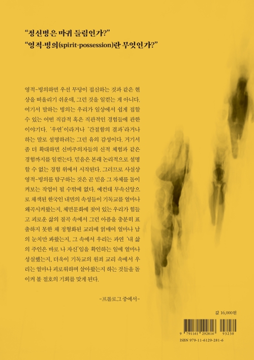 영적-빙의하면 우선 무당이 접신하는 것과 같은 현상을 떠올리기 쉬운데, 그런 것을 일컫는 게 아니다. 여기서 말하는 빙의는 우리가 일상에서 쉽게 접할 수 있는 어떤 직감적 혹은 직관적인 경험들에 관한 이야기다. ‘우연’이라거나 ‘간절함의 결과’라거나 하는 말로 설명하려는 그런 유의 감성이다. 거기서 좀 더 확대하면 신비주의자들의 신적 체험과 같은 경험까지를 일컫는다. 믿음은 본래 논리적으로 설명할 수 없는 경험 위에서 시작된다. 그러므로 사실상 영적-빙의를 탐구하는 것은 곧 믿음 그 자체를 돌이켜보는 작업이 될 수밖에 없다. 예컨대 무속신앙으로 채색된 한국인 내면의 속성들이 기독교를 얼마나 왜곡시켜왔는지, 체면문화에 젖어 있는 우리가 힘들고 괴로운 삶의 질곡 속에서 그런 아픔을 충분히 표출하지 못한 채 정형화된 교리에 얽매여 얼마나 남의 눈치만 봐왔는지, 그 속에서 우리는 과연 ‘내 삶의 주인은 바로 나 자신’임을 확인하는 일에 얼마나 성실했는지, 더욱이 기독교의 원죄 교리 속에서 우리는 얼마나 괴로워하며 살아왔는지 하는 것들을 돌이켜 볼 절호의 기회를 맞게 된다.