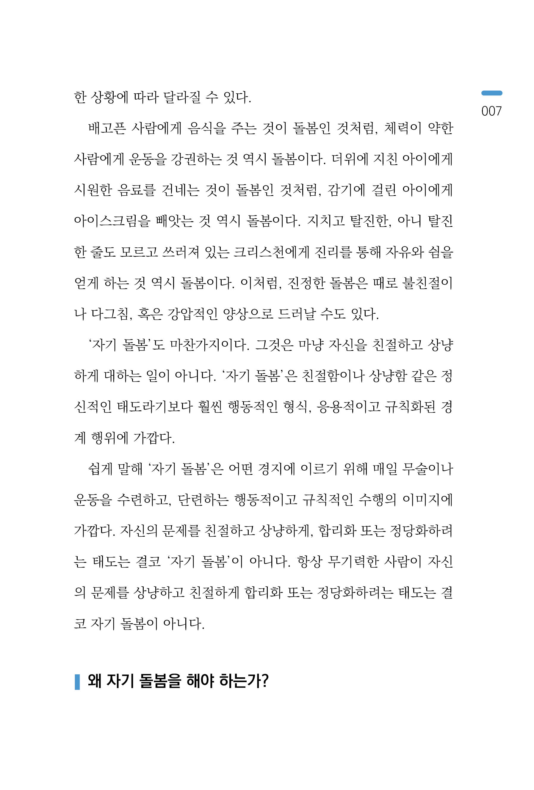 '자기 돌봄'이라는 말은 프랑스의 저명한 철학자이자 사회학자인 ‘미셸 푸코’(Michel Foucault)의 용어로서, 문자 그대로 우리가 각자 자신을 보살피고 돌보는 것을 말하며, 흔히 내가 나의 삶의 주체자로서 어떤 삶을 살지, 내 삶을 어떻게 만들어갈까를 진지하게 고민하는 주체성의 문제이다. 지금까지 인생을 다룬 책들은 대부분 자기 계발서였다. 알다시피‘자기 계발’은 성공한 삶이라는 특정한 삶을 전제하고, 이에 필요한 능력 계발을 통해 이러한 삶에 도달하는 데 목적이 있다. 따라서 자기 계발에서는 자신이 어떤 삶을 살 것인지는 고민의 대상이 아니다. 성공한 삶이 어떤 것인지는 이미 정해져 있는 것이나 마찬가지이기 때문이다. 그러나 '자기 돌봄'이란 '자기 실천'을 통해 스스로 만들어야 할 작품과 같다. 성공을 위한 지침이 아니라, 자신의 삶 자체를 문제 삼는다. 그러기에 구체적 상황에서 내가 나의 삶을 어떻게 영위할 것인가가 핵심 문제로 등장하는 것이 바로 ‘자기 돌봄’인 것이다.