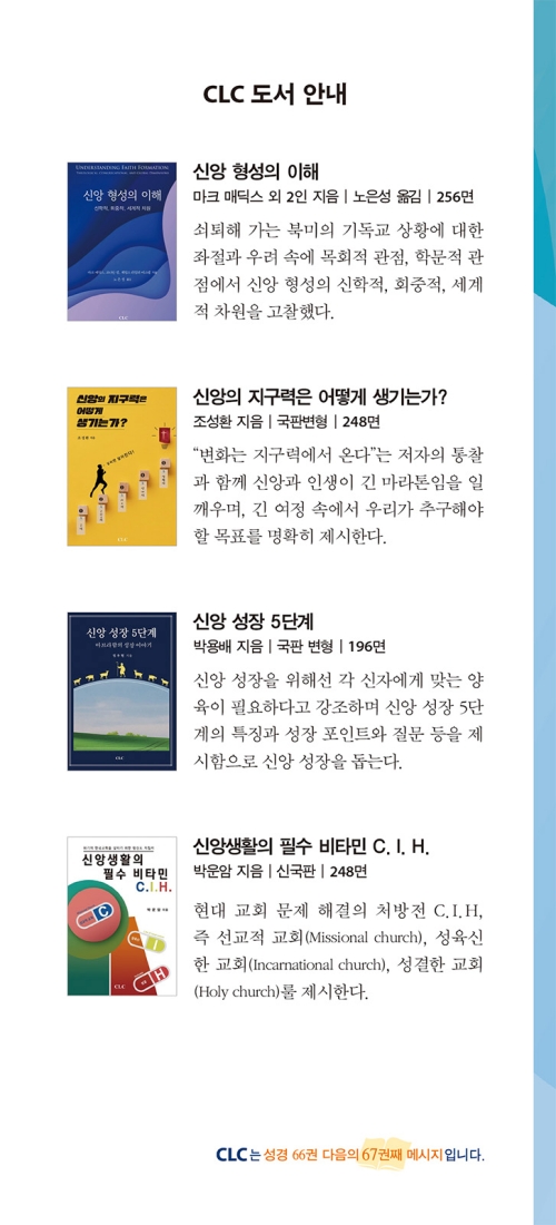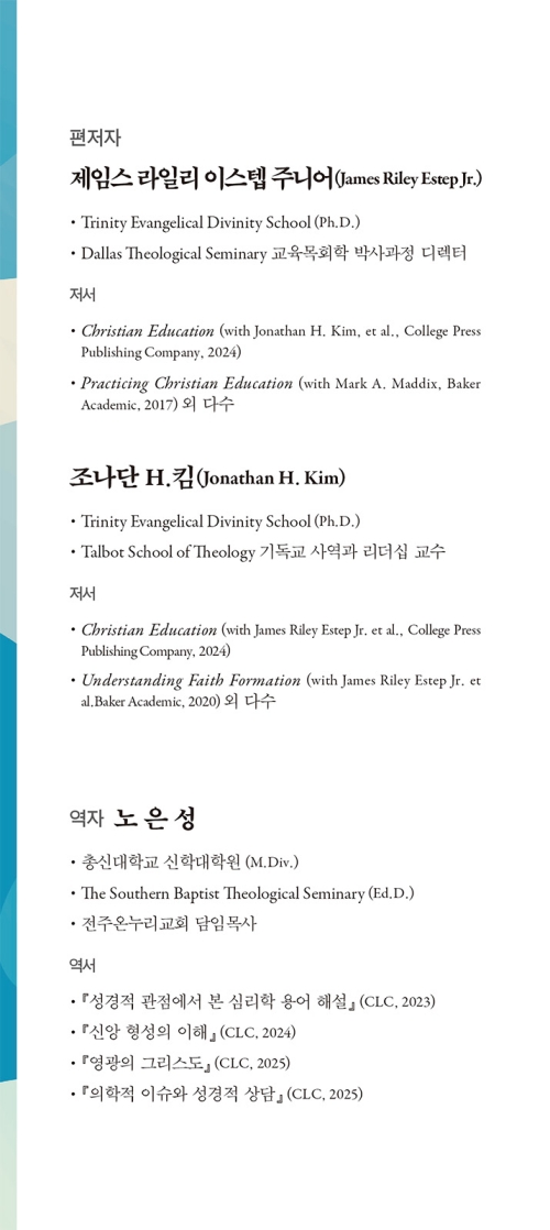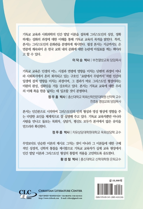 본서는 인간론으로 시작하여 그리스도인의 인격 형성과 영성 형성에 영향을 주는 다양한 요인을 체계적으로 잘 설명해 주고 있다. 기독교 교육자뿐만 아니라 사람을 만나고 돌보는 목회자, 상담가, 평신도 모두가 본서에서 많은 유익을 얻으리라 확신한다.